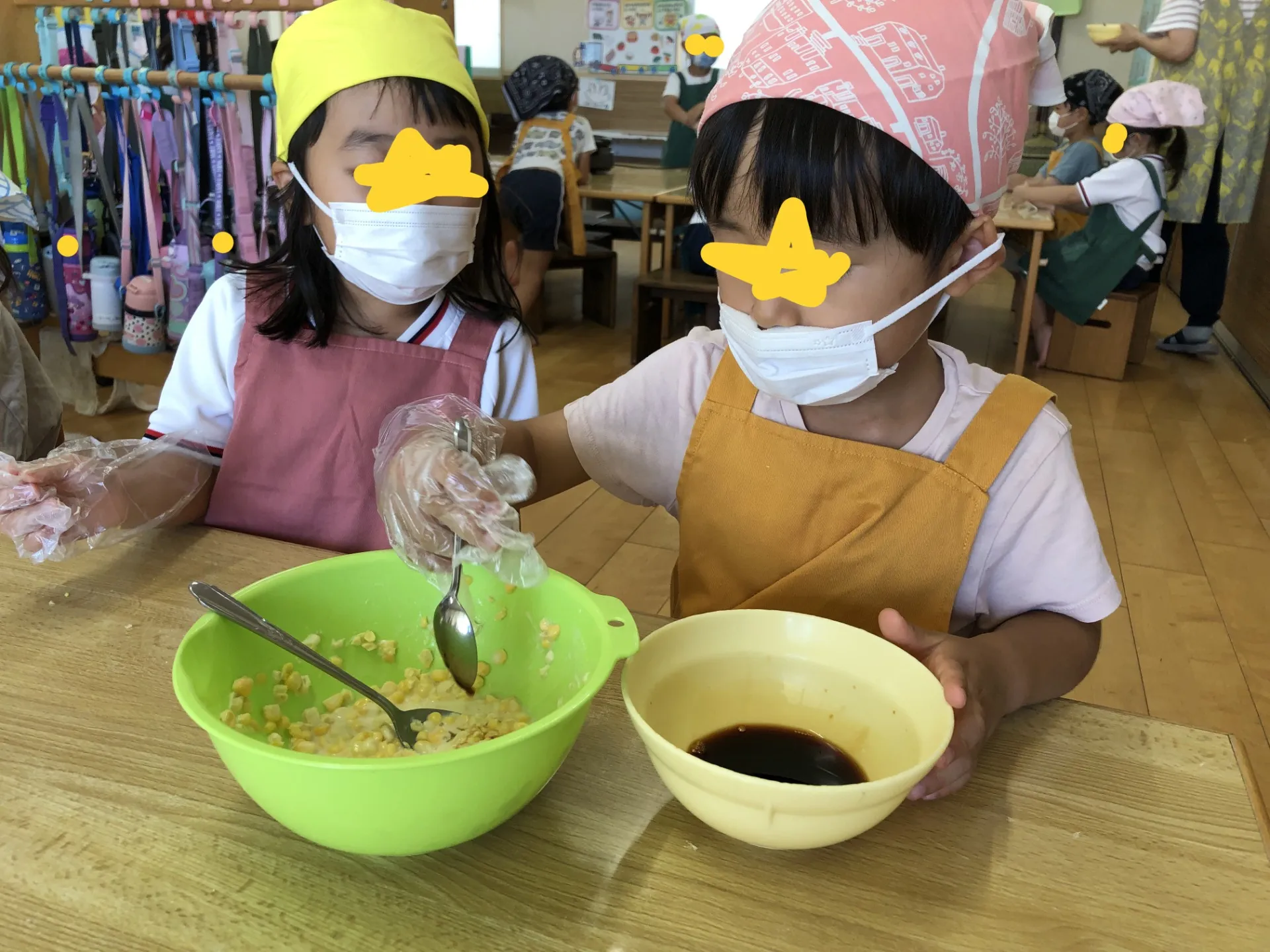 とうもろこしをほぐして、水と薄力粉の分量を子どもたちで量って